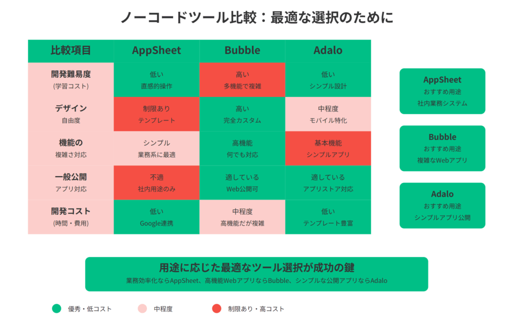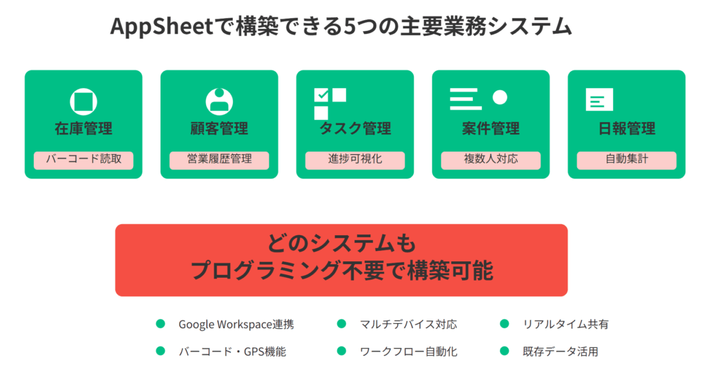 AppSheetは、複雑なシステム開発ではなく、シンプルな業務システムの構築に最適なツールといえます。