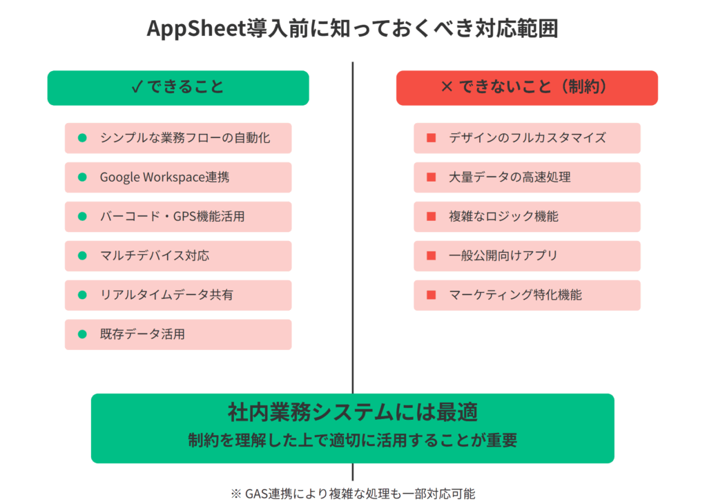 AppSheetは多くの業務システムを効率的に構築できる優れたツールですが、一方で苦手な分野や制限もあります。導入前に把握しておくべき主な制約は以下の通りです。
