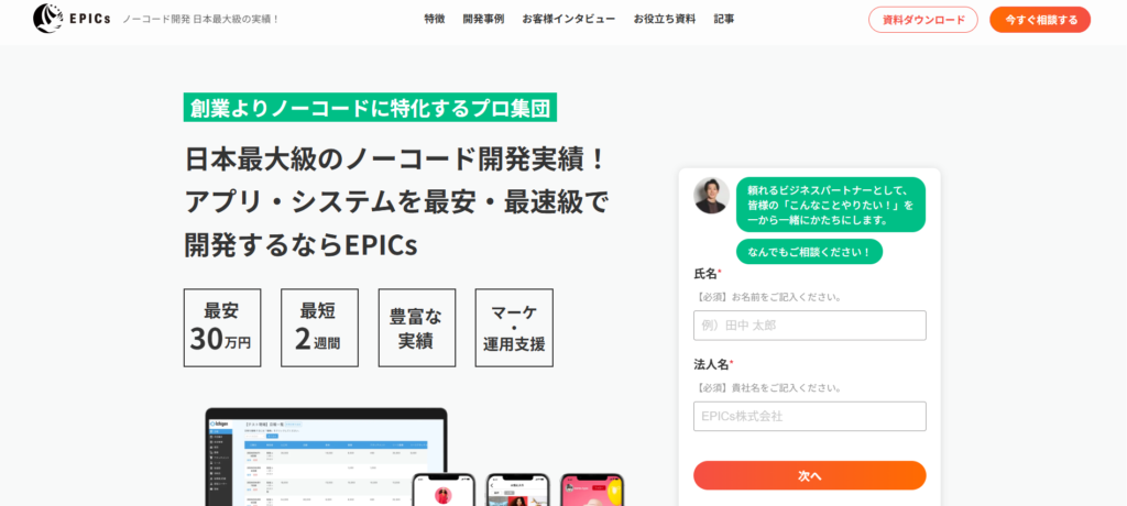 なお、EPICs株式会社では最安50万円・最短2週間からのBubble開発に対応。日本最大級150件以上の実績で培ったノウハウにより、失敗リスクを抑えた開発が可能です。開発後のマーケティング支援まで一貫してサポートいたします。