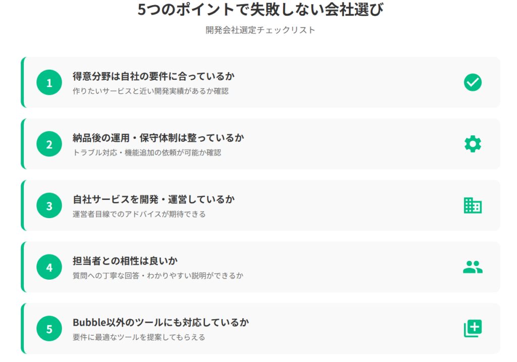 「Bubbleで開発を外注したいけど、どの会社に依頼すればいいかわからない」 「自社に合った開発会社を見つけたいが、選び方の基準がわからない」