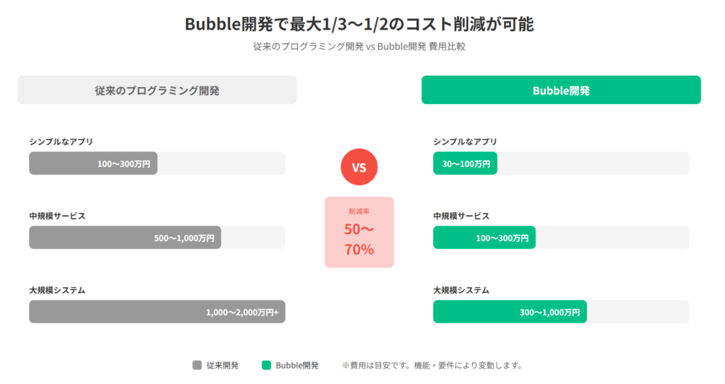従来のプログラミングによる開発と比較すると、Bubbleを使った開発は大幅なコスト削減が見込めます。その理由は主に3つ。