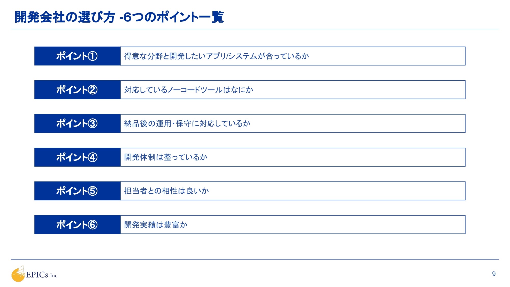 ノーコード開発会社を選定する際のポイントを、日本最大級の開発実績を持つEPICs株式会社が解説。