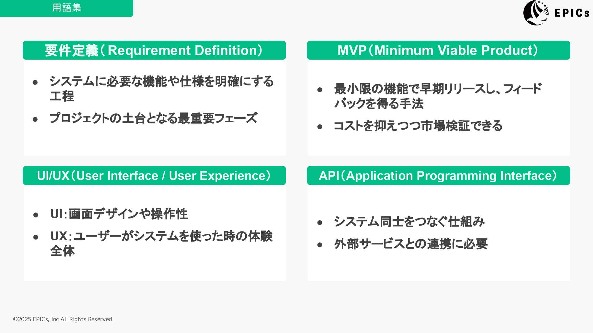 アプリ・システム開発の外注を検討している方に向けて、最低限知っておきたい基礎知識を解説しています。「ウォーターフォール」「アジャイル」「デプロイ」「MVP」「API」といった用語が分からない方におすすめです。
