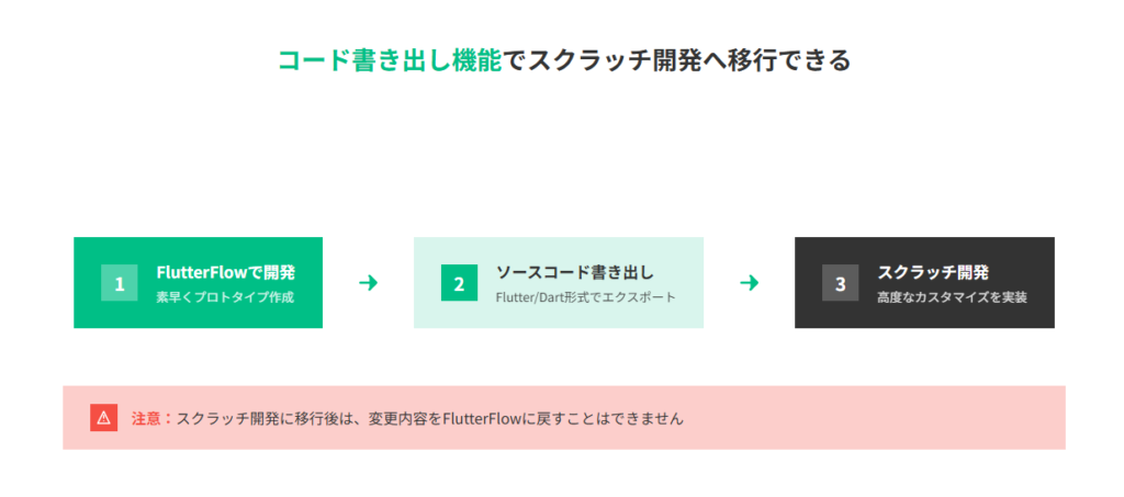 ただし、一度スクラッチ開発に移行すると、その変更内容をFlutterFlowに戻すことはできません。