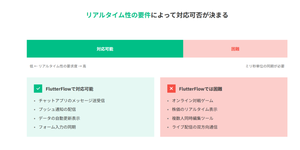 FlutterFlowでもFirebaseを使ったデータの同期は可能ですが、対戦ゲームのように「相手の動きを即座に反映する」「ミリ秒単位で状態を更新する」といった高度なリアルタイム性を実現するのは困難。このような要件がある場合は、従来のコードベース開発を検討したほうが無難です。