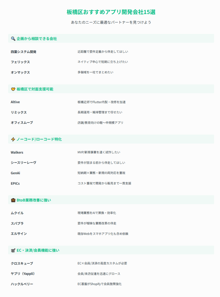板橋区でアプリ開発を検討している企業や個人事業主の皆さまに向けて、おすすめの開発会社を厳選してご紹介します。板橋区に拠点を構える地元密着型の会社から、最新のノーコード技術を活用する先進的な企業まで、様々な特徴を持つ16社をピックアップしました。