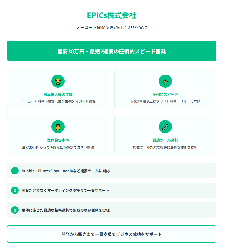 EPICs株式会社は、ノーコード開発において日本最大級の実績を持つ専門開発会社です。最大の特徴は、複数のノーコードツールに対応している点にあります。BubbleやFlutterFlow、Adaloなど様々なツールの中から、お客様の要件に最も適したものを選択することで、開発期間の短縮と費用の削減を同時に実現しています。