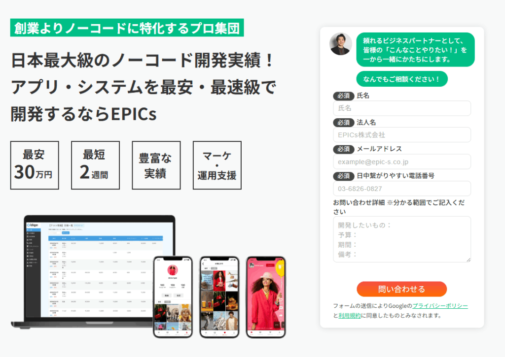 同社の強みは圧倒的なコストパフォーマンスです。最安30万円、最短2週間という価格とスピードを実現しており、予算や時間に制約のあるプロジェクトでも安心して依頼できます。多くのノーコード開発会社が単一のツールに特化している中、EPICs株式会社は案件の性質を見極めて最適なツールを提案してくれるため、無駄のない開発が可能です。