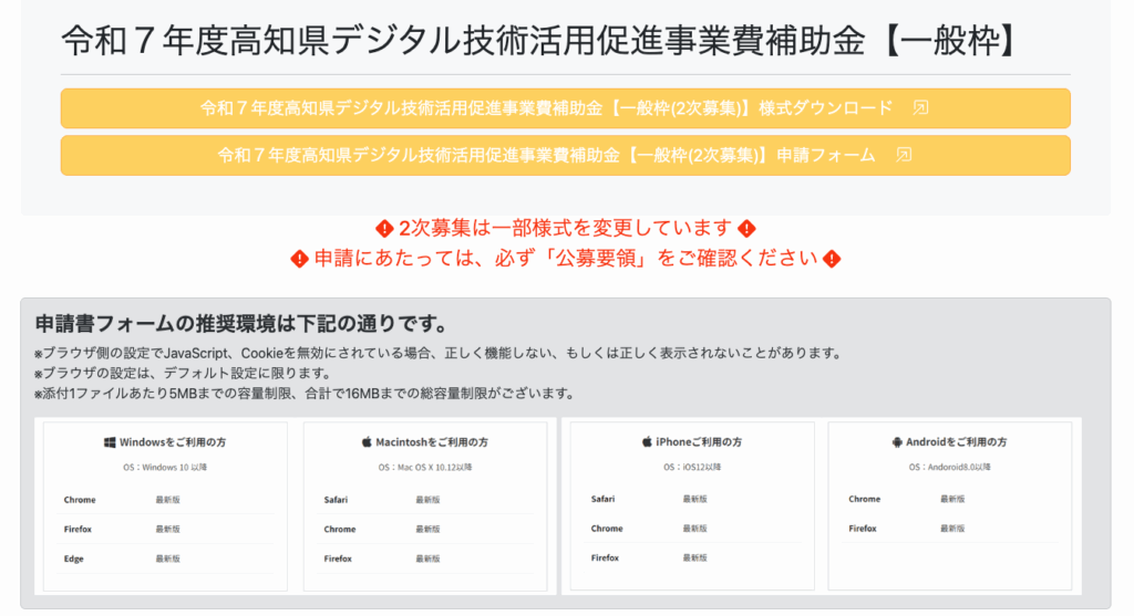 国の補助金に採択されなかった場合でも、高知県独自の「一般枠」を活用できます。補助金額は10万円から450万円までで、補助率は対象経費の1/2以内。アプリ開発に必要なソフトウェアやハードウェアの導入費用が対象となります。