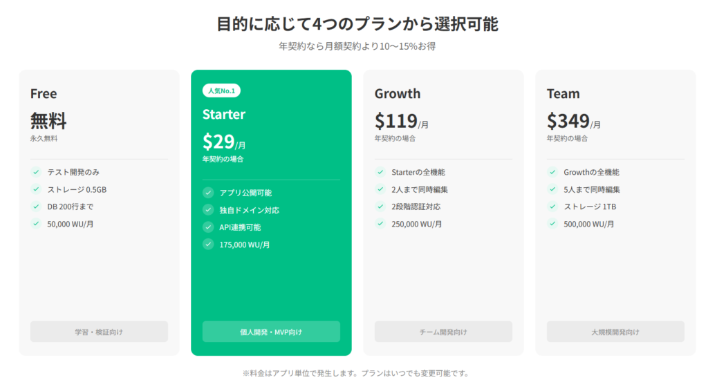 Freeプランで利用できるのは、開発環境でのテスト開発のみ。アプリを実際にユーザーに使ってもらうには、Starter以上の有料プランへの切り替えが必要です。