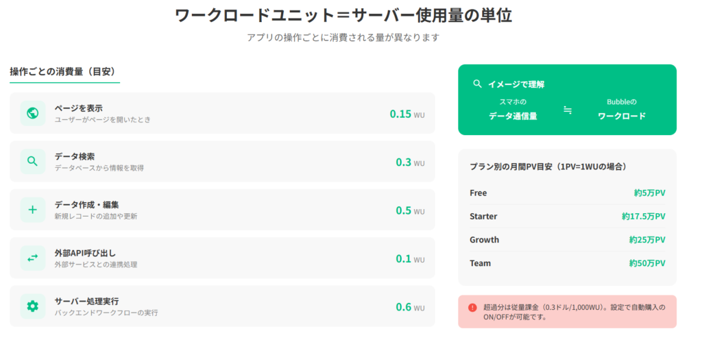 わかりやすく例えると、スマートフォンの「データ通信量」に近いイメージです。動画を見たりアプリを使ったりするとデータ通信量が増えるように、Bubbleで作ったアプリを使うほどワークロードユニットが消費されます。