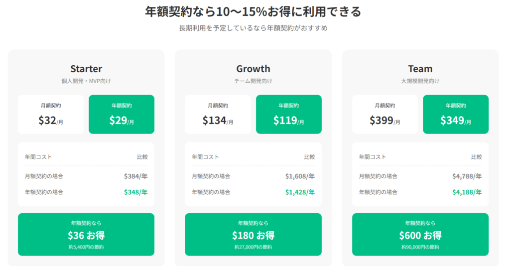 目的によって異なります。テスト開発ならFree、アプリをリリースするならStarter、チーム開発や2段階認証が必要ならGrowth、5人以上での開発や大規模サービスならTeamがおすすめ。まずは安いプランから始めて、必要に応じてアップグレードすればOKです。