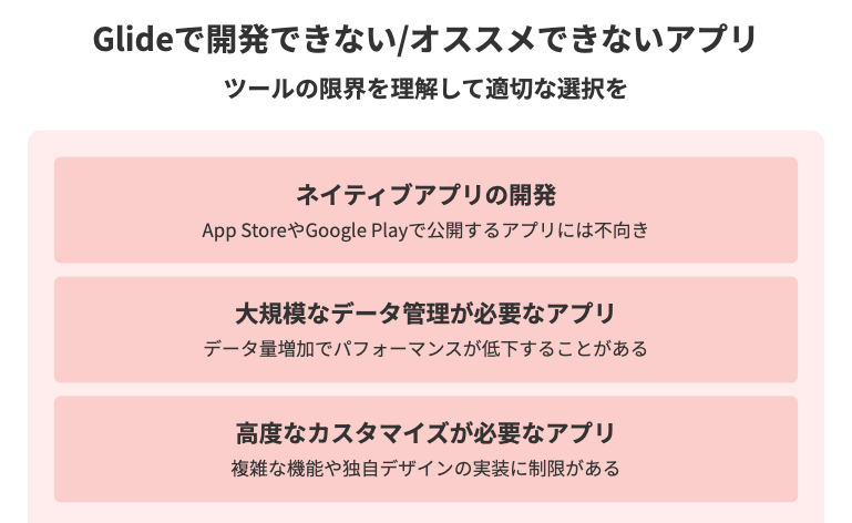 続いて、Glideで開発できるアプリ、開発できない/おすすめしないアプリについて説明していきます!